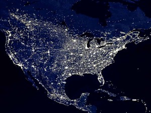 Compare the following images of the United States. The first is a photo of the night sky with its artificial lights taken from space, courtesy of C. Mayhew and R. Simmon, NASA and the National Geophysical Data Center (now known as the National Centers for Environmental Information). Imagine all those artificial lights gobbling up the night sky with all its stars, planets, comets and other wonders at a rate of approximately 6% a year, which is it. At the same time, much of the existing human-generated light as well as the artificial light-spewing invaders is becoming brighter as LEDs slowly but surely replace other artificial light sources. Simultaneously the higher replacement costs associated with the increased demand for these more energy-efficient light sources will mean fewer funds for proper shielding to focus these lights downward.