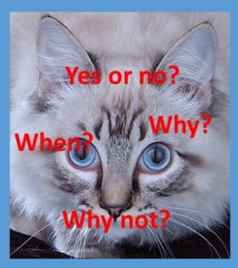 So what did I learn from this? I learned that there are no right or wrong answers and that the only way to be sure is to choose to remain ignorant. Whether we like it or not, the slogan “Responsible pet owners spay and neuter their pets” is passé. We now live in an age in which responsible pet owners need to educate themselves regarding both the benefits and harm of this surgery, make a conscious choice regarding when and if to do it based on that knowledge plus knowledge of our own animals and household, and then willingly accept the consequences of that choice on all affected.