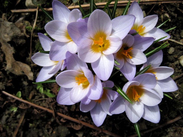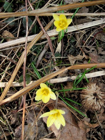 And below are pictures of the intrepid mini-crocuses. The pale lavender ones were the first to show themselves beneath the snow in their usual location. But the yellow ones came as a complete surprise as few days later. Had I not slipped when I jumped off the stone wall near the woodpile, landed on my behind in a mound of soggy snow, and had to roll toward the hillside in order to right myself, I would have missed these even more petite heralds of spring amid the brush. I honestly can admit that this the first time that I’ve wound up soaking wet from a fall in a sloppy snow pile and felt grateful for the experience.