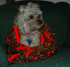 The truth is that for many of us getting everything done that needs to get done during the holiday season is based on the assumption that all nonhuman household members will cooperate. They won’t swallow ribbon, drag the new baby’s toy under the couch and have at it, knock over the tree, or eat food meant for guests and barf up same on the bed. They won’t terrify carolers with their yodels, barks and howls, express their anal glands and take off when they see Uncle Joe dressed as Santa, or curl their furry bodies around Grandma’s neck as they purr, suck and knead the fake fur collar of her robe. In short, they will behave perfectly.