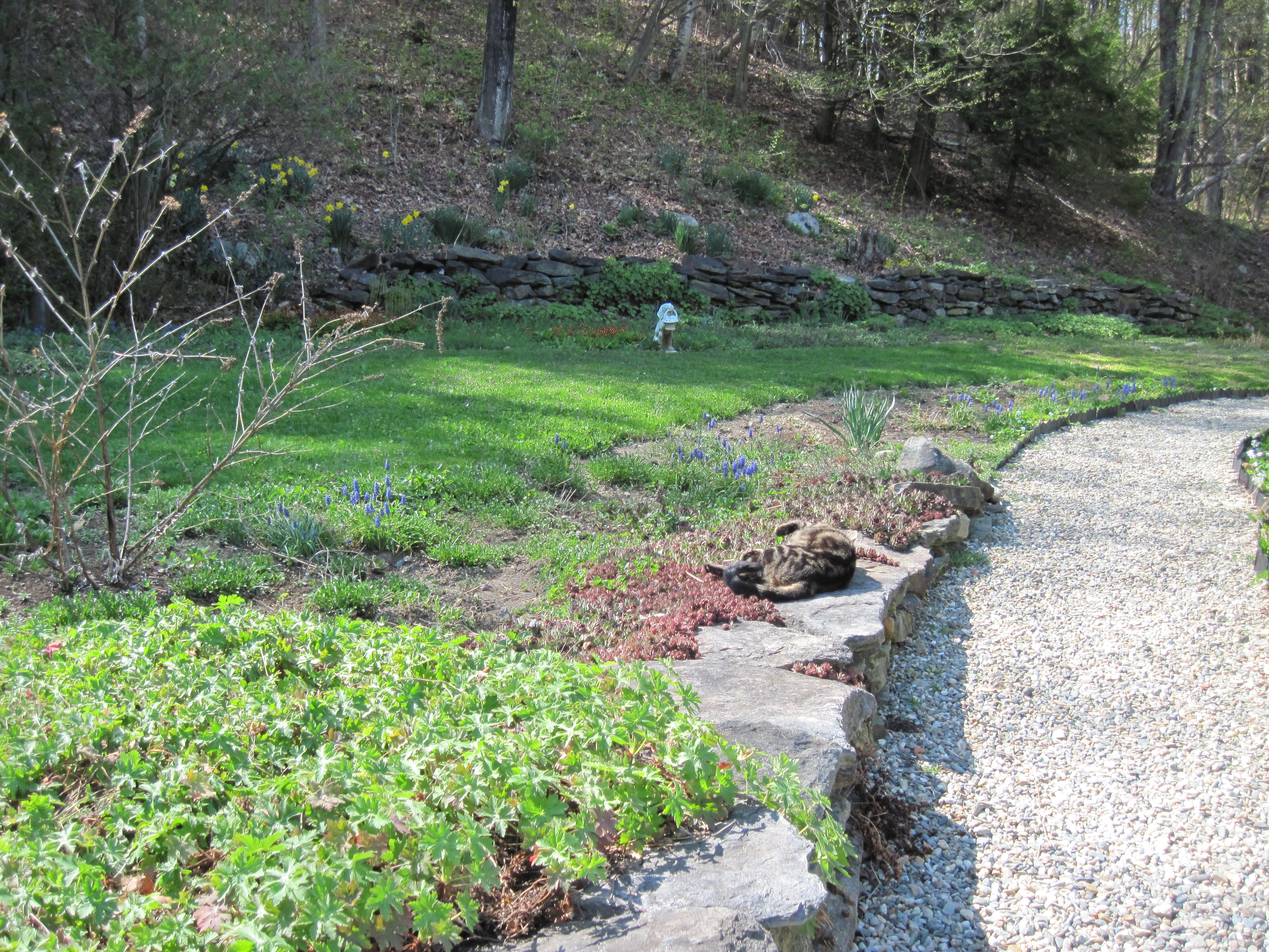 he enjoys blissfully taking advantage of the wall’s sun-warmed capstones in the early spring.