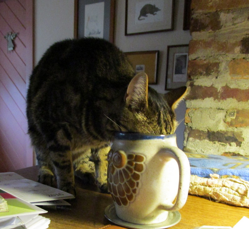 water, stuck his head into it and began to drink. There was once a time when this would have bothered me—germs and all that, doncha know—but this is no longer the case. Instead it’s background activity, part of our working routine that carries no emotional charge. However, this time he suddenly lifted his head and alerted to something outside. I noticed his focused body language and automatically lifted my head and became more alert to what was going on outside too. Then I heard the distinct clatter of a local truck