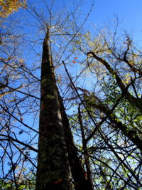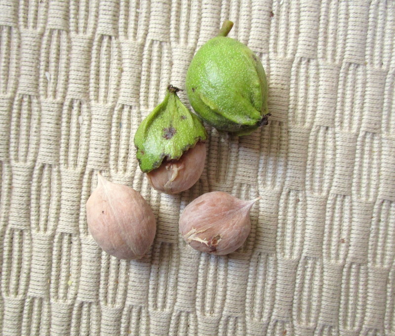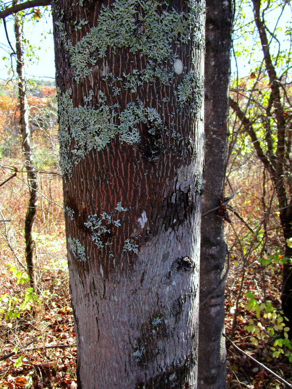 A fairly smooth grey-tan bark with patches of lichen adds to its beauty. It still amazes me how many times I walked right past it over the years and never noticed it! And how could I miss the nuts on the road and beneath the tree all these years–assuming they were there?