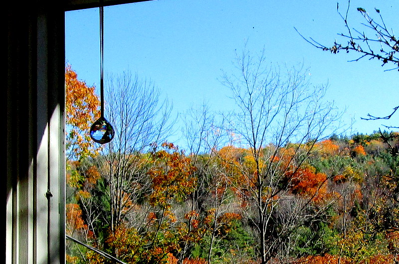 A view of the tree’s crown from my kitchen window. And finally, a (highlighted) picture of the Butternut Squirrel making one of this futile attempts to curl up and sleep in the crown of his tree: