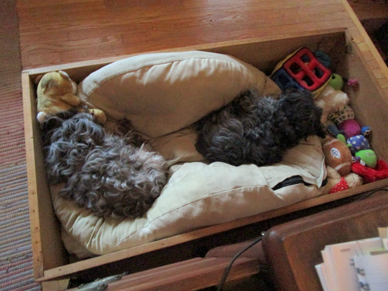 Cabin fever also causes Bamboo to increase his repertoire of games, most of these guaranteed to bait the dogs in some way. For a while he resurrected the Cleopatra Game in which he rolls himself up in the cotton rug in my office. Once inside the rug, he waits for an unsuspecting dog to walk by the end of the rug. When one does, a feline front leg shoots out with the speed of a striking cobra, he whaps the dog with his paw, then retracts it before the dog knows what happened. He used to do this to me too, until the day his sneak attack caused me to drop a full mug of coffee on the floor in front of him. I believe his mad dash through the coffee and my energy-intense response convinced him that, unlike the often clueless dogs, Mommy Dearest wasn’t a safe target this game.