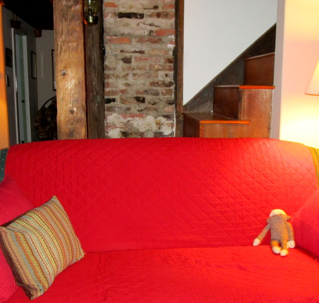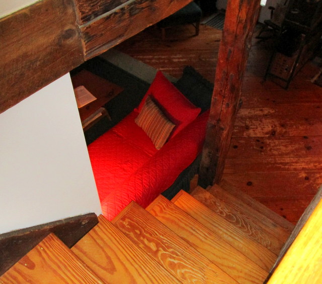 The scene: I live in an old house with a narrow, mostly open staircase that terminates in my second-floor office. The bottom of the stairs informally separates the living room from the kitchen and Great Area. I call it the Great Area because a lot goes on there, not because it’s that great. Because the living room is long and narrow, the only place the couch fits is next to the stairs.