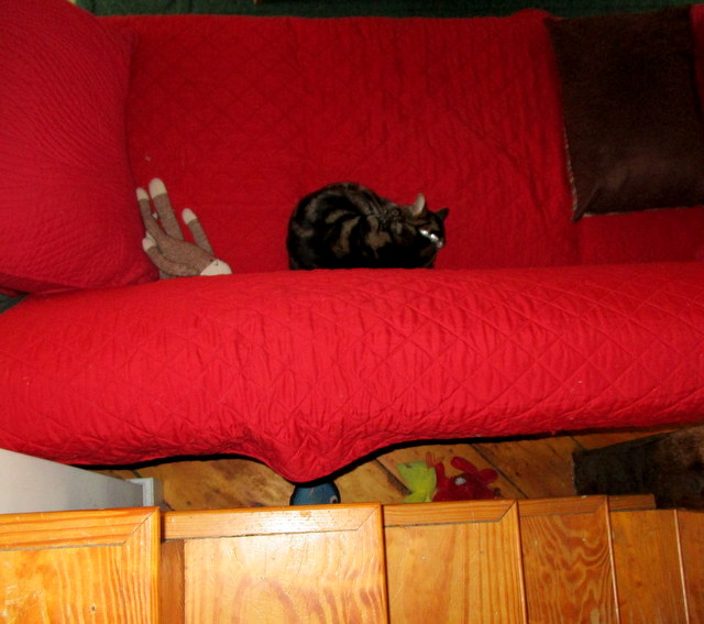 Enter the cat vibrating with cabin fever energy and looking for a place to dissipate it. Perhaps by a process of trial and error I missed while working or otherwise involved, he discovered that if he stretched himself full-length and crammed his upside-down body in the space where the seat of the couch meets the back, the dogs couldn’t see him as they came down the stairs. Or if they did, by then it would be too late because the unsuspecting dog already would have jumped from the step. When a dog did jump, Bam would lunge upward and whap the dog with his front paws from below. As cat and dogs have honed their skills, they’ve adapted the game accordingly.